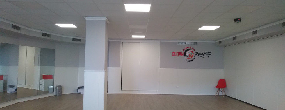 Se ha realizado una insonorización de suelo (*), techo y paredes. Además se instala un falso techo fonoabsorbente de fibra tipo Rockfon Pacific, que mejorará el tiempo de reverberación (eco) en las aulas y garantizará un confort acústico. Además, este local tiene una particularidad, la instalación de un tabique móvil para la posibilidad de dividir el aula central.
